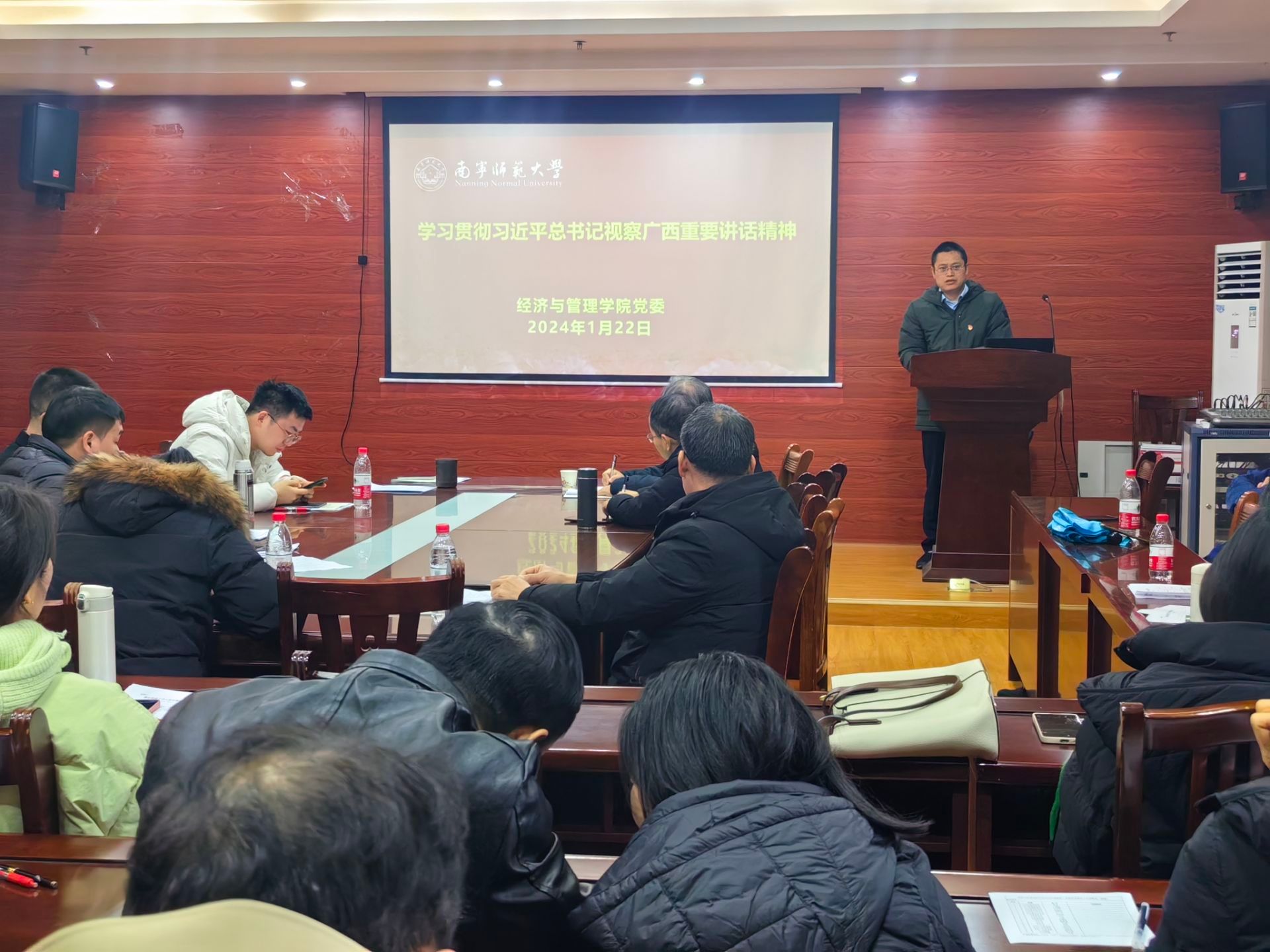 纪明书记就新华社刊发的《习近平在广西考察时强调 解放思想创新求变向海图强开放发展 奋力谱写中国式现代化广西篇章》全文进行领学。纪明书记指出,大家要深入学习贯彻习近平总书记视察广西时的重要讲话精神,自觉把思想和行动统一到习近平总书记重要讲话上来,充分发挥学院优势,为建设新时代中国特色社会主义壮美广西贡献经管力量;要完整、准确、全面理解和贯彻习近平总书记解放思想创新求变向海图强开放发展 奋力谱写中国式现代化广西篇章的深刻内涵,以习近平总书记的重要讲话精神为指引,从中汲取奋进的智慧力量,认真谋划好学院发展各项工作;要跟随习近平总书记在广西考察的脚步,结合个人教学科研和工作实际,细细体会足迹中的深意,善于从总书记足迹中挖掘和凝练新形势下科学研究的选题方向,提高个人的科学研究与社会发展的契合度。