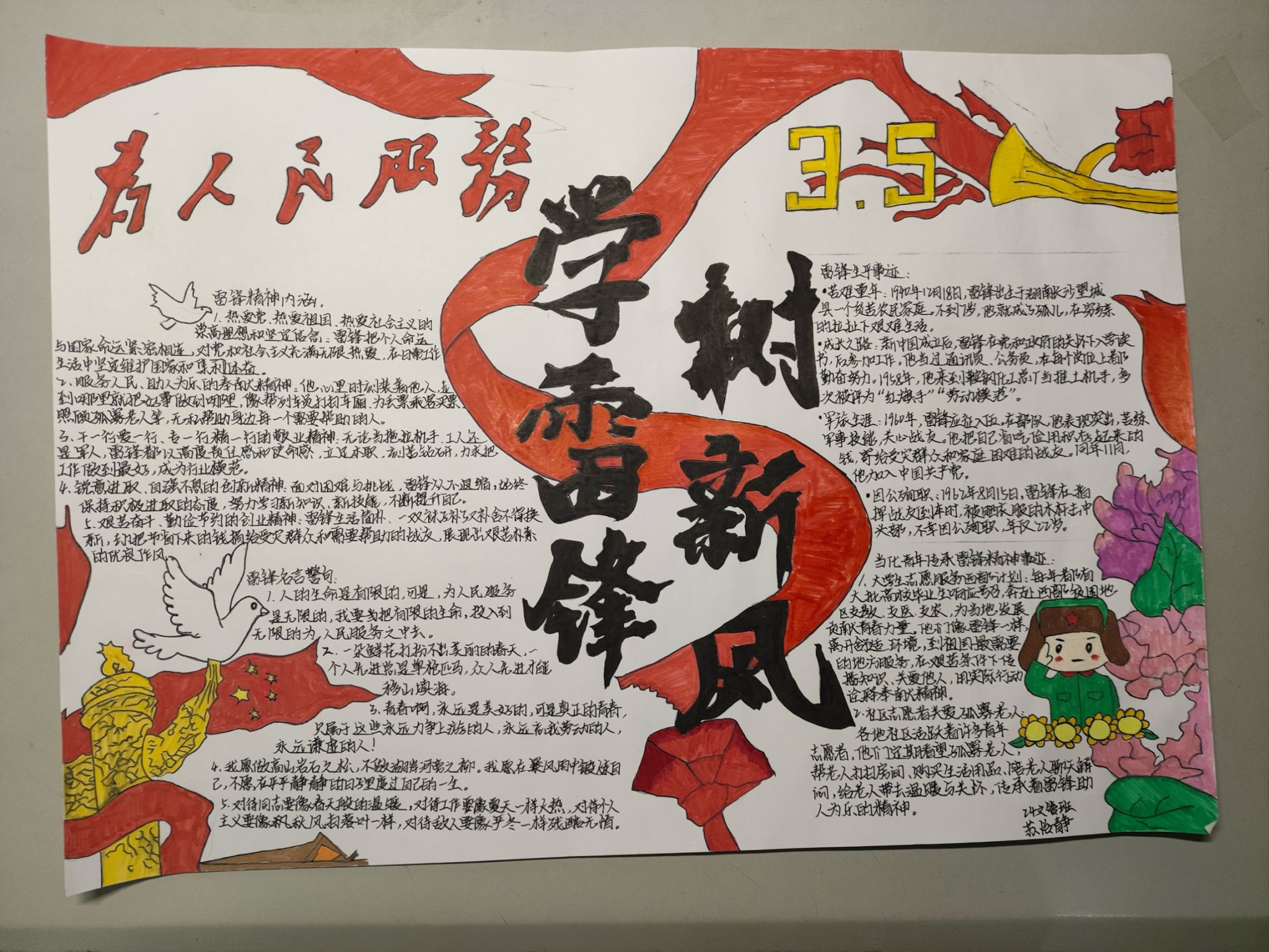 活动期间,同学们以手抄报为载体,通过绘画、书法的表现形式,生动展现了雷锋同志的光辉事迹、经典语录以及新时代青年对雷锋精神的理解。手抄报内容涵盖“助人为乐”“爱岗敬业”“艰苦奋斗”等主题,既有对雷锋故事的深情回顾,也有对雷锋精神的深刻诠释与时代传承。活动结束后,青年志愿者协会共收到37份作品,不少作品以创意排版、工整字迹和深刻内容脱颖而出,展现了同学们对雷锋精神的独特诠释。此次活动不仅为同学们提供了展现艺术才华的平台,更通过实践深化了青年一代对雷锋精神的理解。参与者在创作中感悟到“钉子精神”的坚持与奉献价值,进一步增强了社会责任感和集体凝聚力。