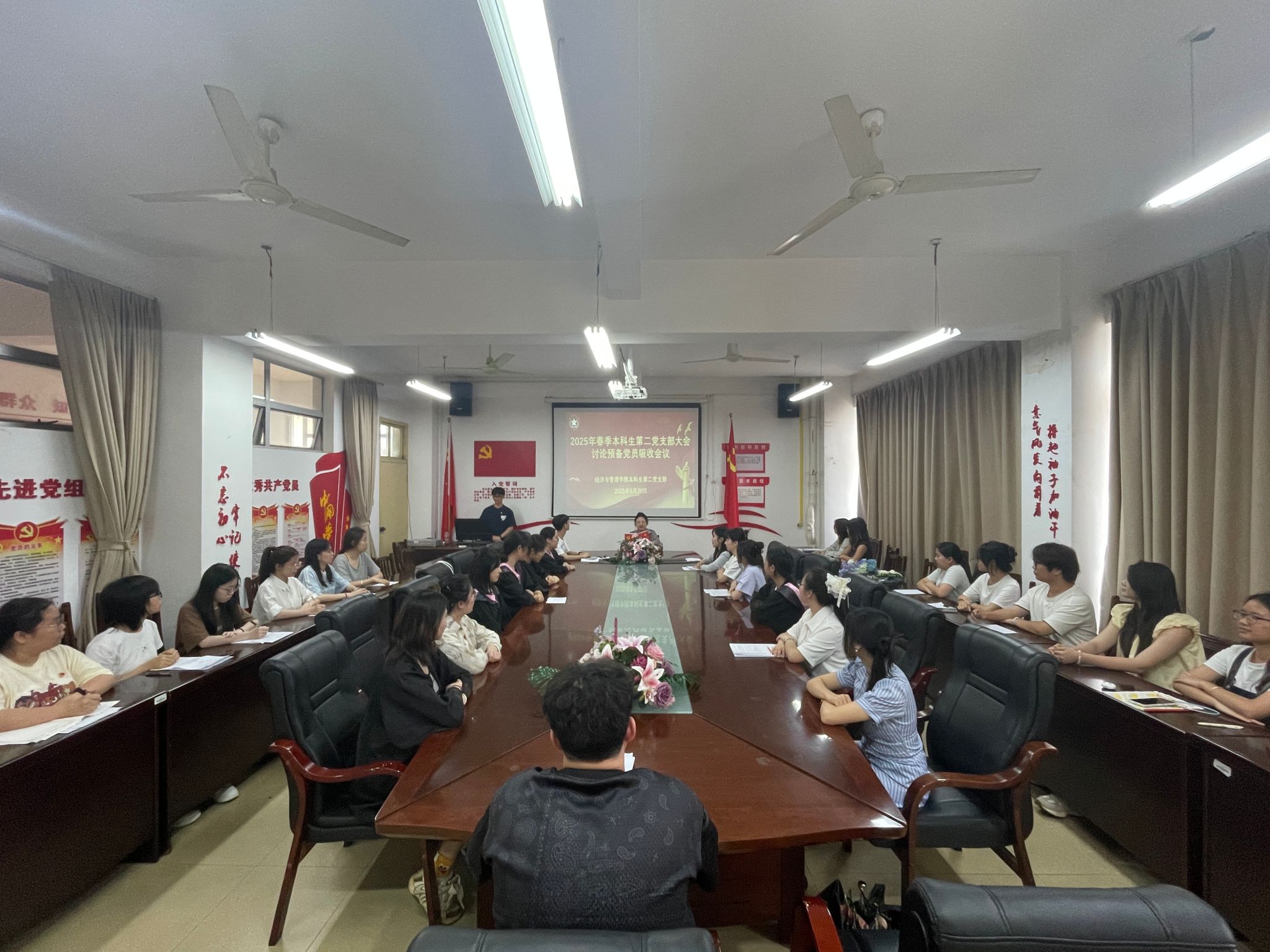 本科生第二党支部在明秀校区文星楼召开了预备党员吸收大会。本次会议由副书记黄耀杉同志主持,支部正式党员、预备党员及新发展对象,共34人参加会议。