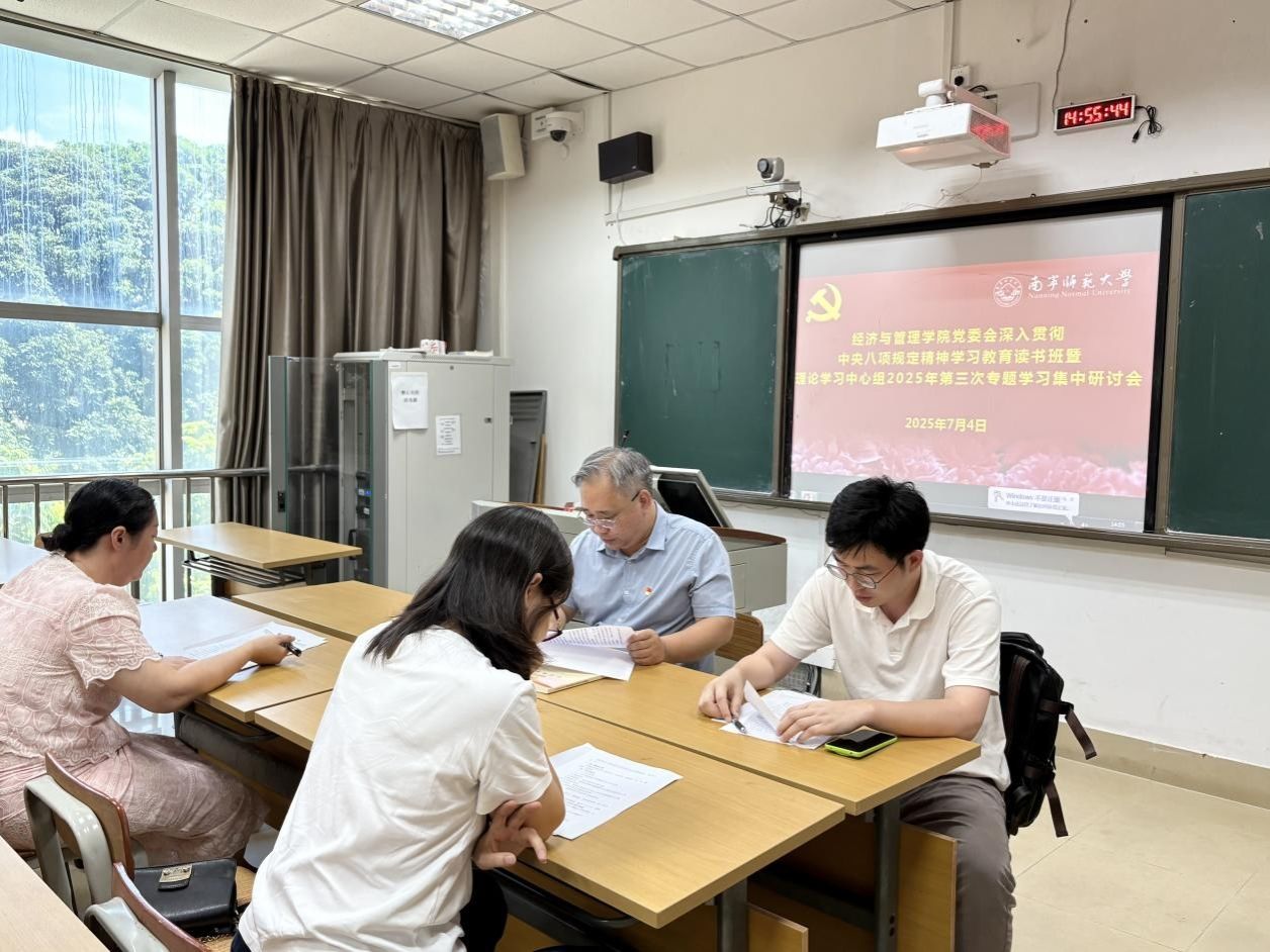 党委在明秀校区文星楼310室召开深入贯彻中央八项规定精神学习教育读书班暨理论学习中心组2025年第三次专题学习集中研讨会。学院党委理论学习中心组成员参加会议,会议由学院党委书记韦海鸣主持。