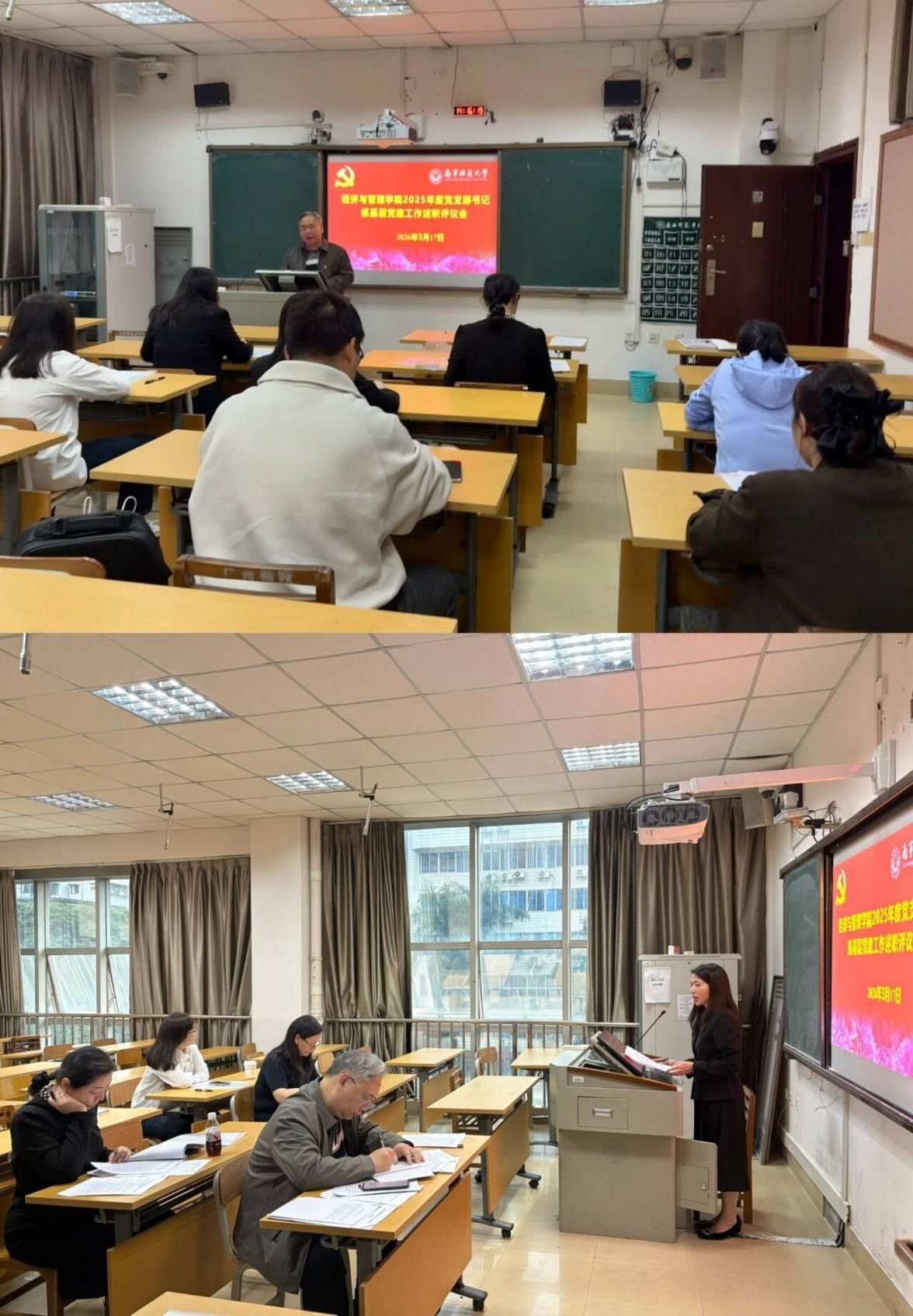 在文星楼310教室召开2025年度党支部书记抓基层党建工作述职评议会。会议由学院党委书记韦海鸣主持,学院党委委员、各党支部书记参加。