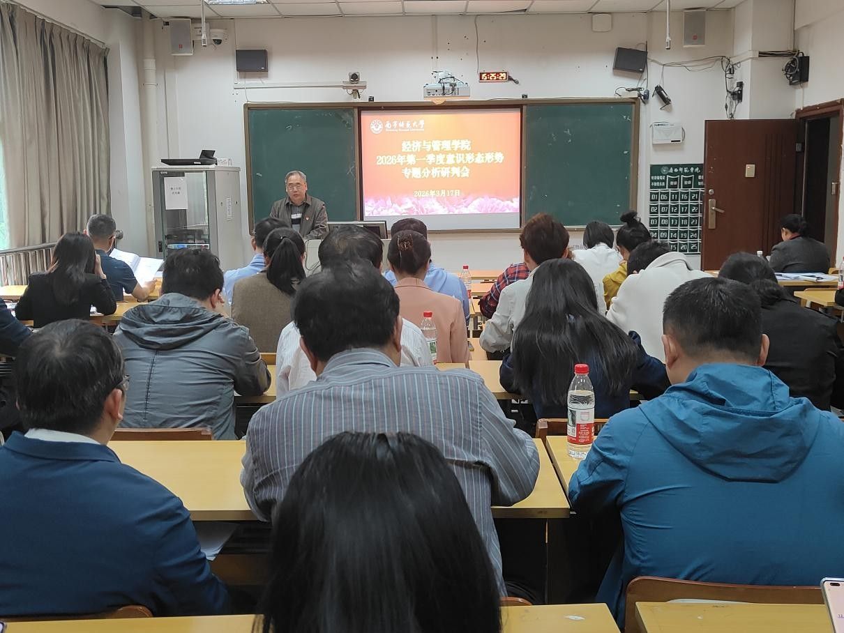 在明秀校区文星楼308教室召开2026年第一季度意识形态与安全稳定研判会。学院党委书记韦海鸣主持会议并讲话,全体教职工参会。