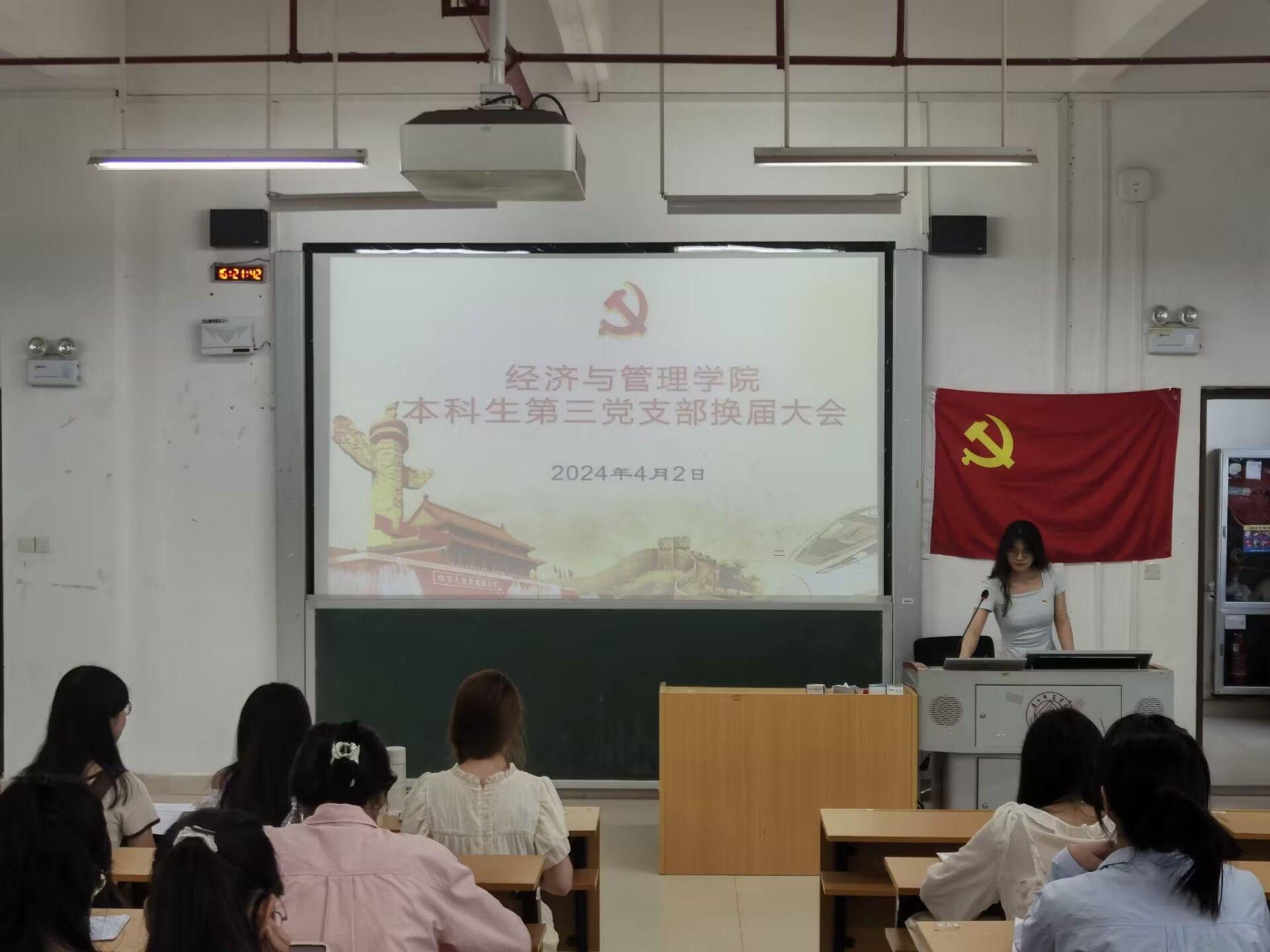 本科生第三党支部在文综220教室召开支部换届大会,会议由副书记苏敏主持,全体支部党员参加会议。