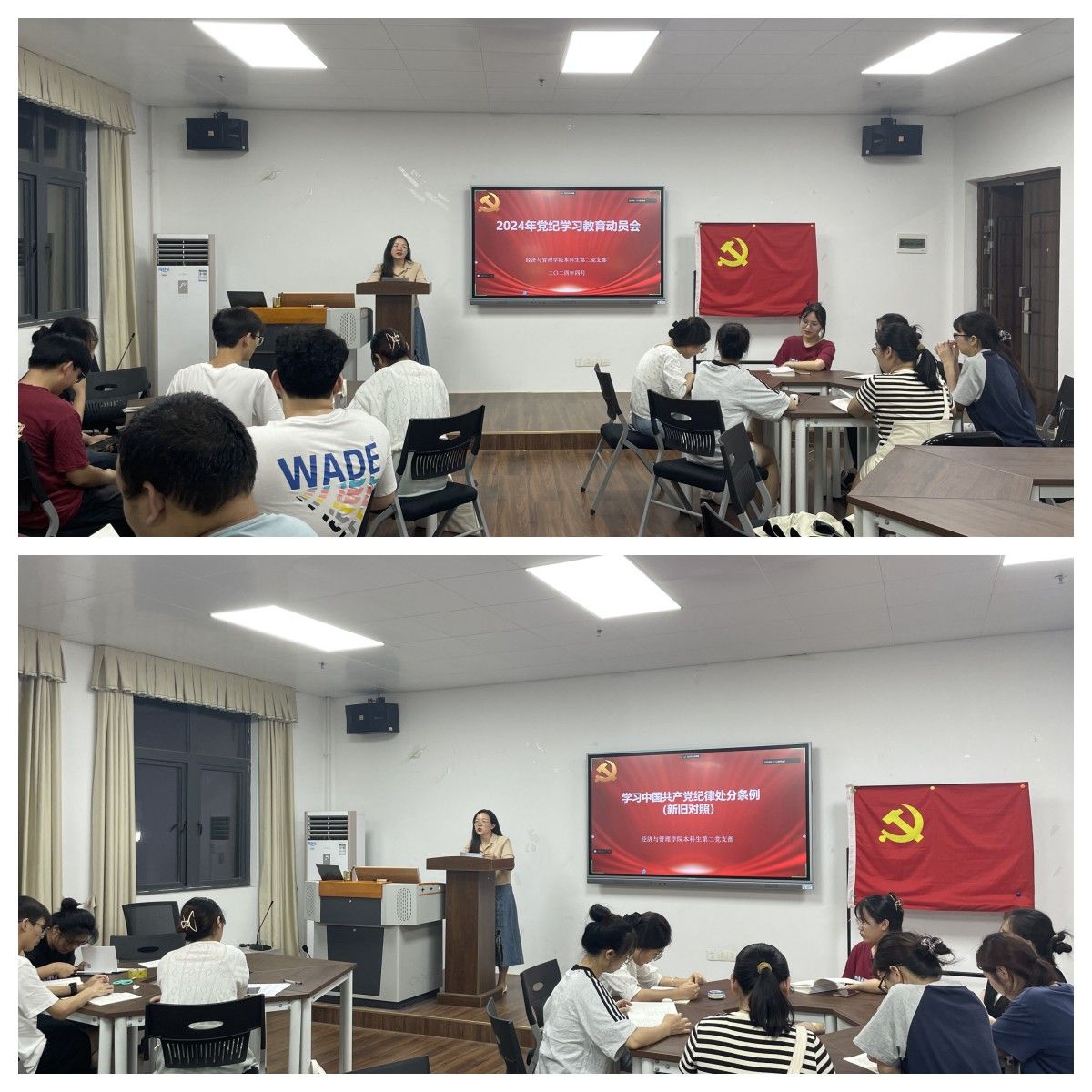 本科生第二党支部在五合校区召开2024年党纪学习教育动员会暨党员党纪学习教育党课。此次会议采取线上线下相结合的方式进行,会议由支部书记刘家瑶主持。