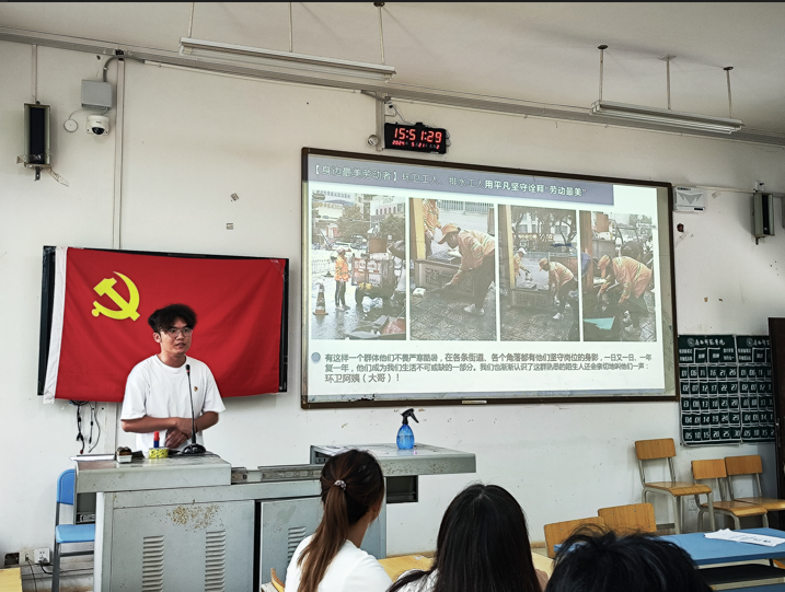 接下来是发现身边最美劳动者的分享环节李明慧等4名同志以图片展示的形式向党员们讲述图片背后的劳动者故事。李明慧同志分享了强降雨中环卫工人、交警和消防员在恶劣天气下迅速行动,保障市民安全与交通的身影。赖华健同志分享排水工人在恶劣天气中坚守岗位,疏通排水,保障城市免受水患的身影。陆志洪同志分享宿管阿姨从事平凡工作,却又悄无声息地关怀着每位同学的身影。黄羽同志分享食堂的阿姨默默提供了干净整洁的用餐环境的身影与贵阳荔波的环卫,默默捞除湖中树叶,保护着湖泊的美丽的身影。