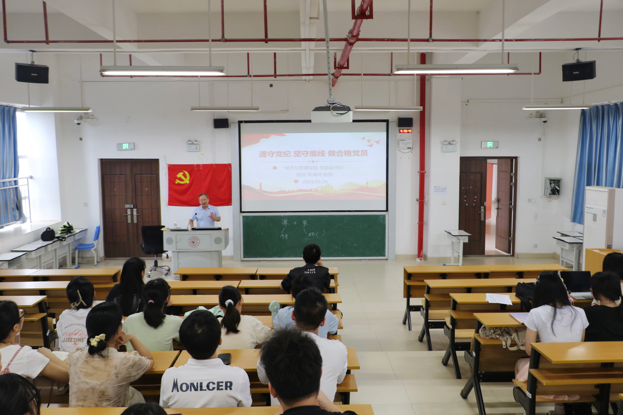 为扎实开展好党纪学习教育,引导青年学生党员学纪、知纪、明纪、守纪,528日,成人探花 在五合校区文理综合楼开展了以“遵守党纪 坚守底线 做合格党员”为主题的党课。由成人探花 党委副书记、院长韦海鸣教授担任主讲人,研究生第一党支部和研究生第二党支部全体党员参加学习。