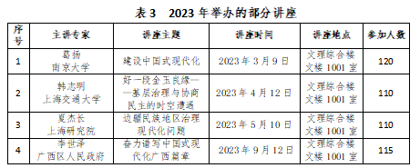 组织开展主题为沿边开发开放为主题的2023年研究生学术论坛。与龙州县委宣传部共建研究生联合培养基地,为同学们提供实习实践平台。与广西大学、广西民族大学等进一步加强MIB研究生培养合作的合作,共享兄弟院校优质的师资。邀请广西发展研究中心李世泽等领导专家到校为同学们开展讲座,增长了知识,开拓了视野(见表3)。