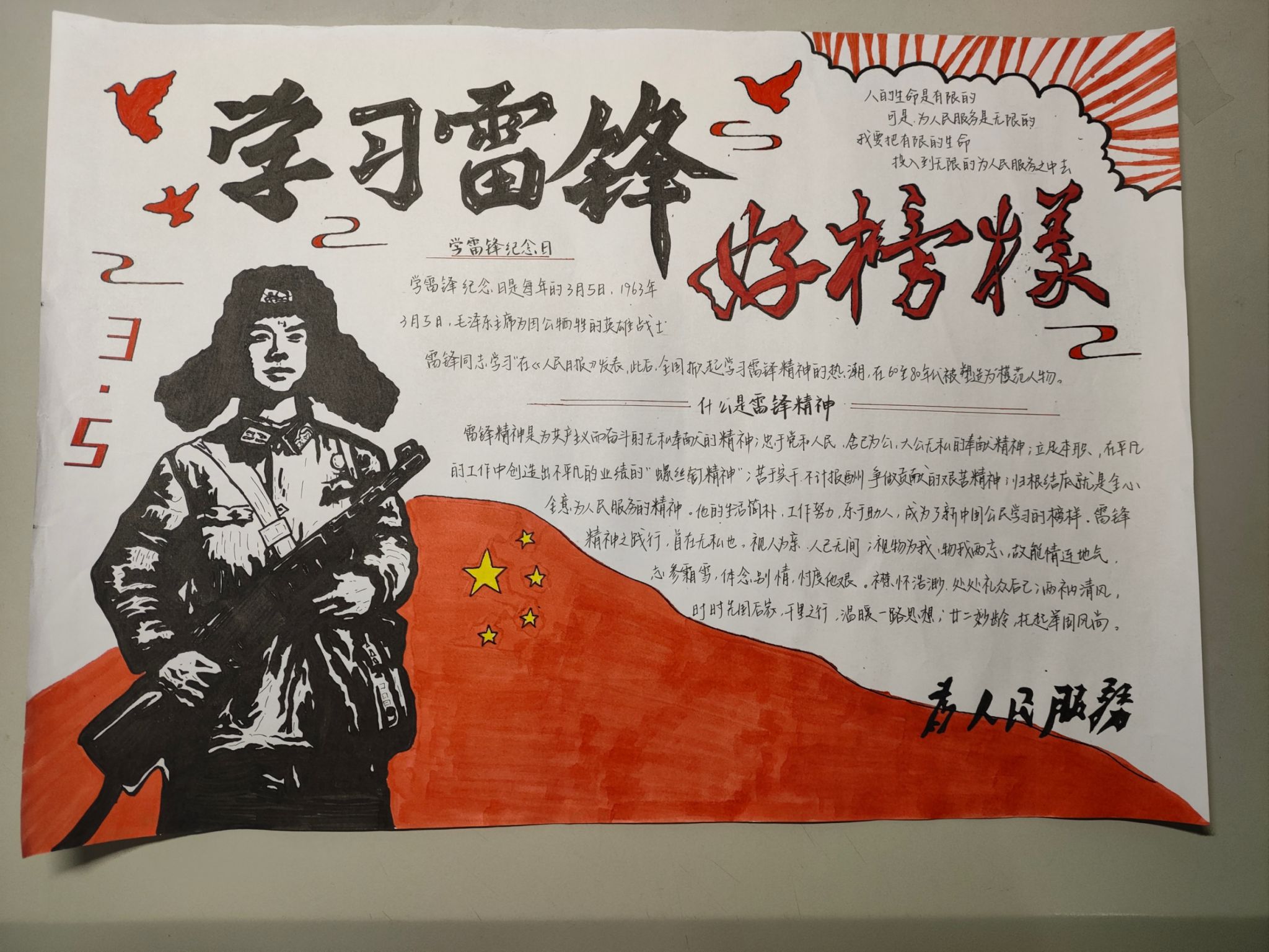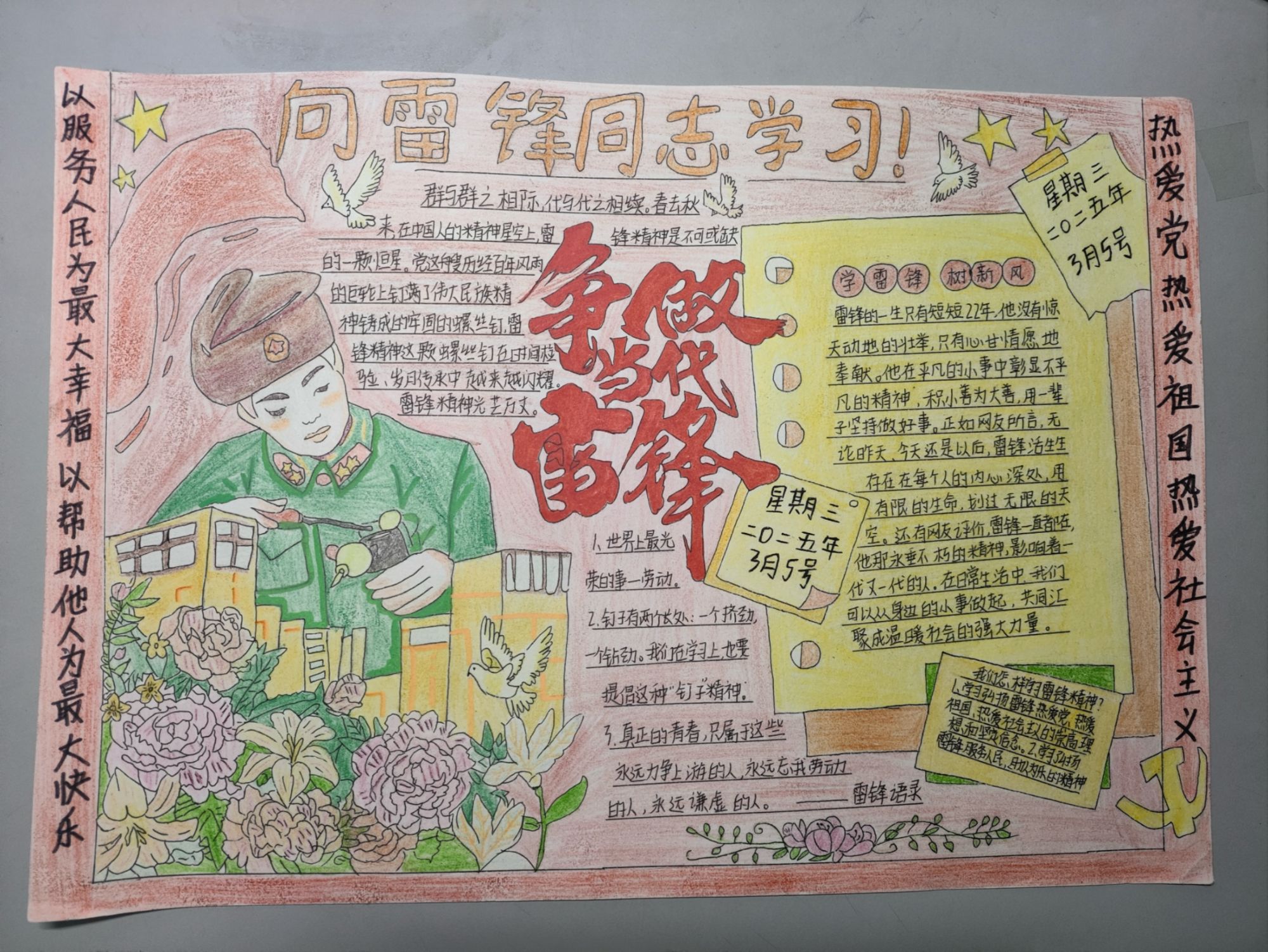 青年志愿者协会以“传承雷锋精神,共绘青春风采”为主题,面向全院学生开展了手抄报创作活动。此次活动旨在通过手绘与文字结合的形式,引导同学们深入理解雷锋精神的时代内涵,弘扬无私奉献、团结友爱的社会风尚,进一步提升青年学子的思想道德素养。
